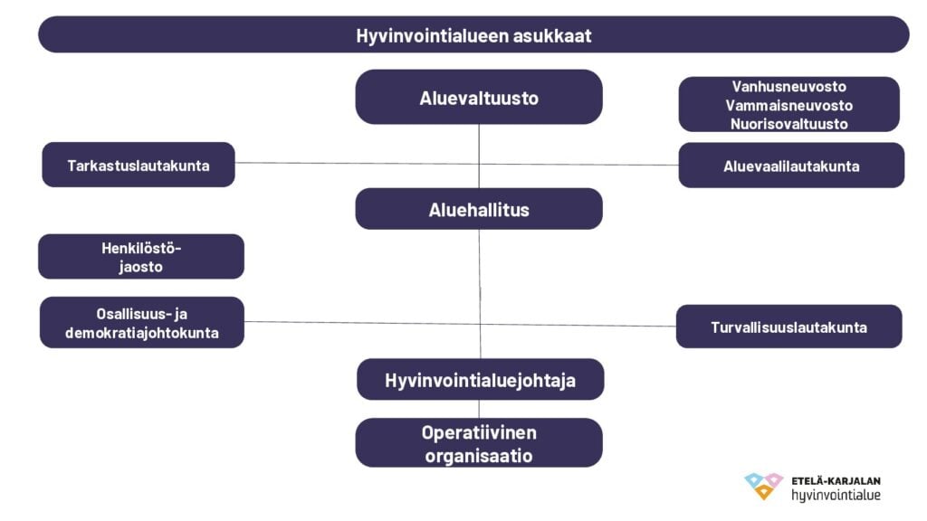 Etelä-Karjalan hyvinvointialueella ylin päätösvalta on aluevaltuustolla. Operatiivisesta johtamisesta vastaa valtuuston valitsema hyvinvointialuejohtaja.